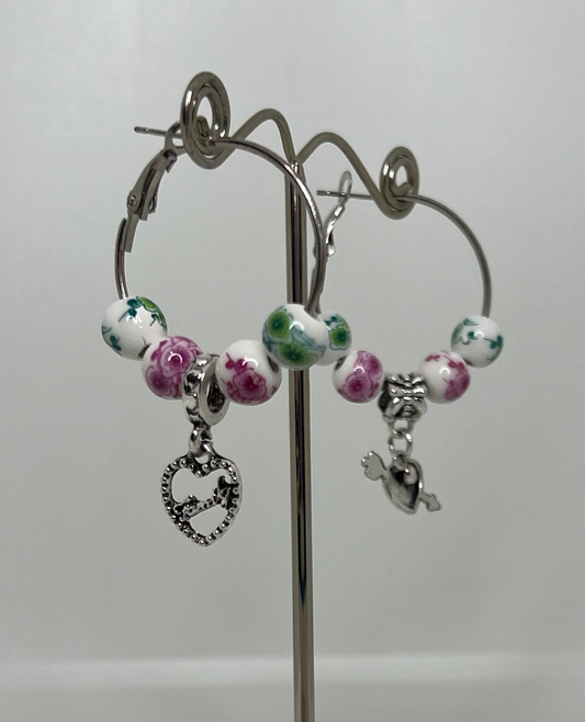 Boucle d'oreille fait main anneau avec perle et en son centre un coeur mauve