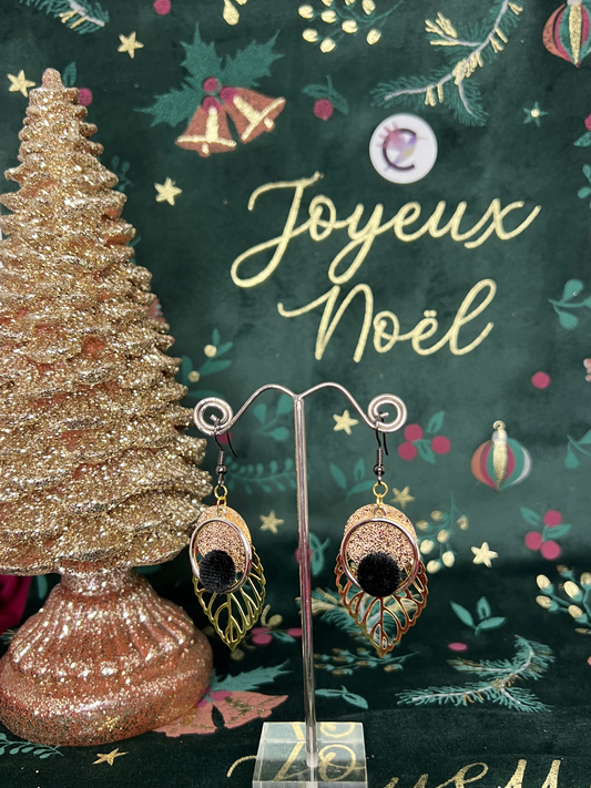 🍃🖤 Élégance Naturelle : Boucles d'Oreilles Feuille avec Pompon Noir dans un Anneau 🖤🍃